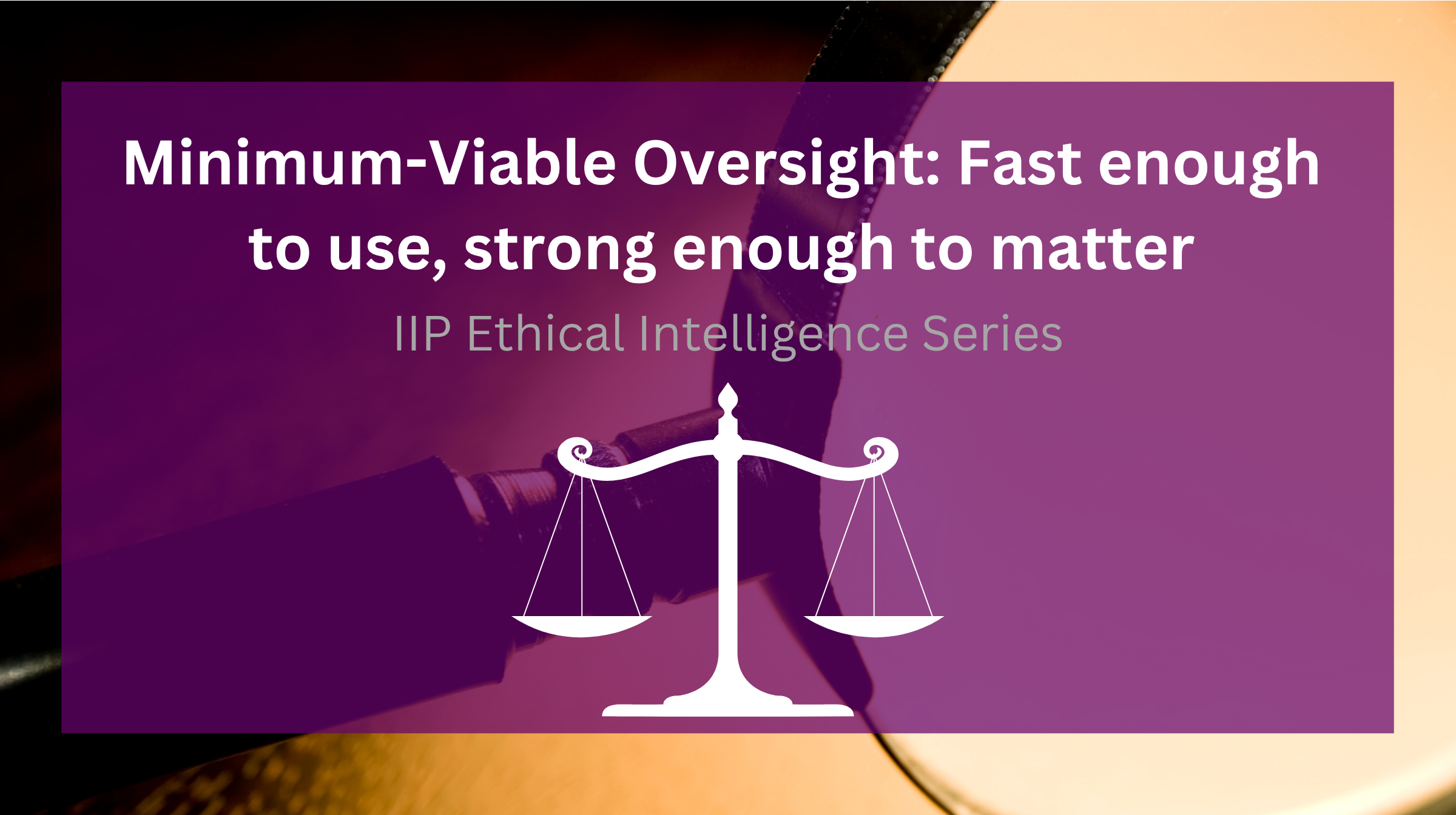 Minimum-viable oversight (MVO) is a lightweight governance pattern that adds structure to make decisions safe, accountable, lawful and ethical. It keeps routine work moving, applies proportionate checks when a decision could cause harm or is hard to reverse, and builds a short record in the flow of work so anyone can see what was decided, by whom, and on what basis. It is anchored in clear ethical requirements—fairness, transparency, respect for privacy and autonomy, responsible use of data, and active management of conflicts of interest—with human judgment applied when dilemmas arise.